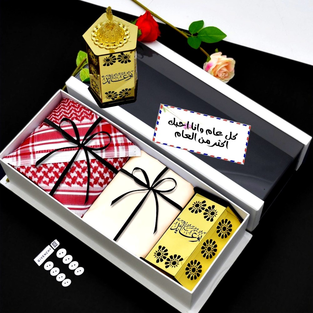 بوكس العيدقماش صيفي الالوان اكثر مبيعاشماغ سوبر ديلوكس قطنمتوفر مقاسات 55\58\60مبخره رجالي اكريلك لون الذهبي كتابة الاسم حسب الطلب