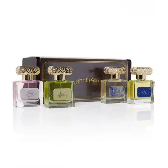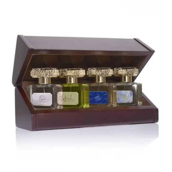 تقدم لكم جنيد تشكيلة من العطور التي تمنحكم الثقة والانتعاش في كل وقت. توفر لك المجموعة انواع العطور البخاخ الأفضل مبيعاً في علبة خشبية جميلة مزينة بالذهب مع أربع بخاخات صغيرة ذهبية وبحجم مثالي سعة 30مل. تشمل العلبة عطر